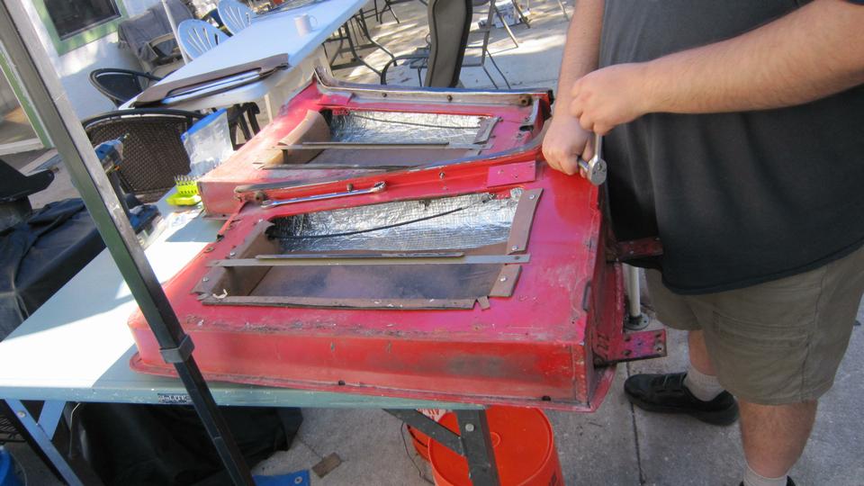 We did get all the rear wing bolts removed, and managed to pull out the piping all in one piece, both sides. We had at it gently with an orbital sander smoothing the shoulder of the body panels along the piping joints. That went well with few surprises, but we were running out of daylight, so time to reassemble the car enough to drive it overnight. We should get more pictures tomorrow. Two bolts in each rear wing was enough, two large nuts (and flat washers) for the rear bumper, two wires for the tag light, six screws to reattach the rag top frame, and two studs for LTD fasteners (one each side). Put the side curtains on, pack up the toys, and ready to roll.