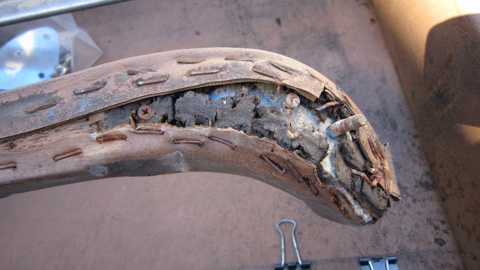 When removing the left side trim rail the side curtain peg socket was rusty enough that it ripped apart in the middle. Oops. And the rust had expanded so much that it had split the wood rail. Oops again. Well, the wood rails had survived 36 years and half a million miles, and two or three fabric re-coverings, so I recon they don't owe us anything, just order up some more new parts.