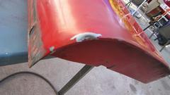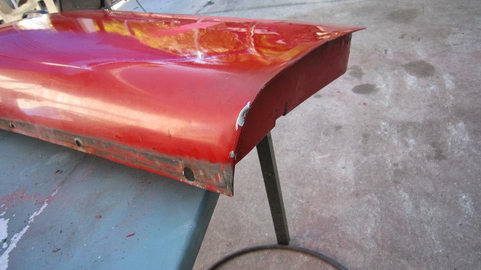 Next looking at the left rear wing with the dogleg in very good condition. Upper left corner of that picture is where it got the dent repair last summer. The second picture is just an example of removing a little blistered paint with only minor rust underneath.