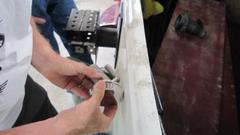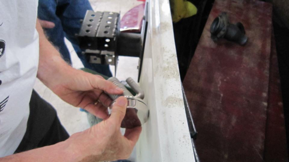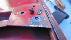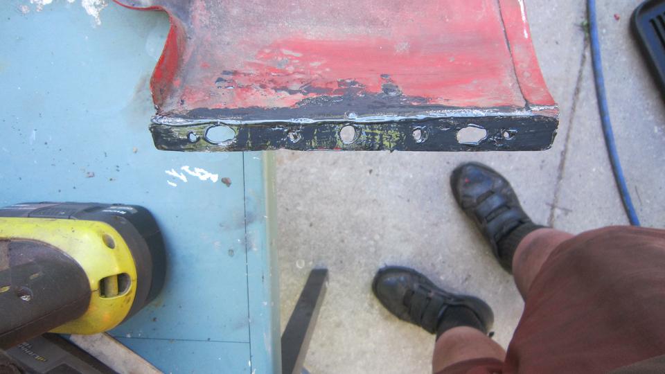 This is what the same flange looks like after rasping and sealing with JB Weld. Still a bit more to do to finish filling the last hole. We had a few hours of this kind of work, with a short lunch break in between, including filling some minor perforation on the main body just aft of the doors. Too busy to take more pictures, but you get the idea.