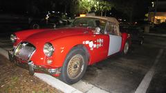Then we could finally get busy with a little body work and surface finishing on the doors. Those were finished and in primer coat before sun down, ready for finish paint, hopefully early tomorrow. While the primer was drying we re-installed the boot lid and began clean up and packing tools. Right at dusk we were reinstalling the doors and door top trim rails and side curtains, thanks for the drilled alignment holes. And we get to do it at least one more time tomorrow. The rolling restoration is not quite as efficient as doing it all at once, but it does let us drive it every day (and better than trying to refinish the doors in situ).