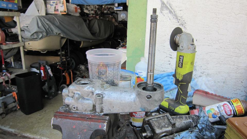 Intending to wait 6-hours for the top coat paint to set up some, we jumped into the chores of cleaning up two well used gearbox shift extension assemblies, hoping we could make one good one out of three abused ones (including the broken one remove from the car in September). First one was crusty and rusty, soaking in penetrating oil for a few days. Finally got it disassembled with a couple big hammers, spent an hour scraping with a knife and washing it in lacquer thinner. Yield from this was one serviceable housing plus two good levers.