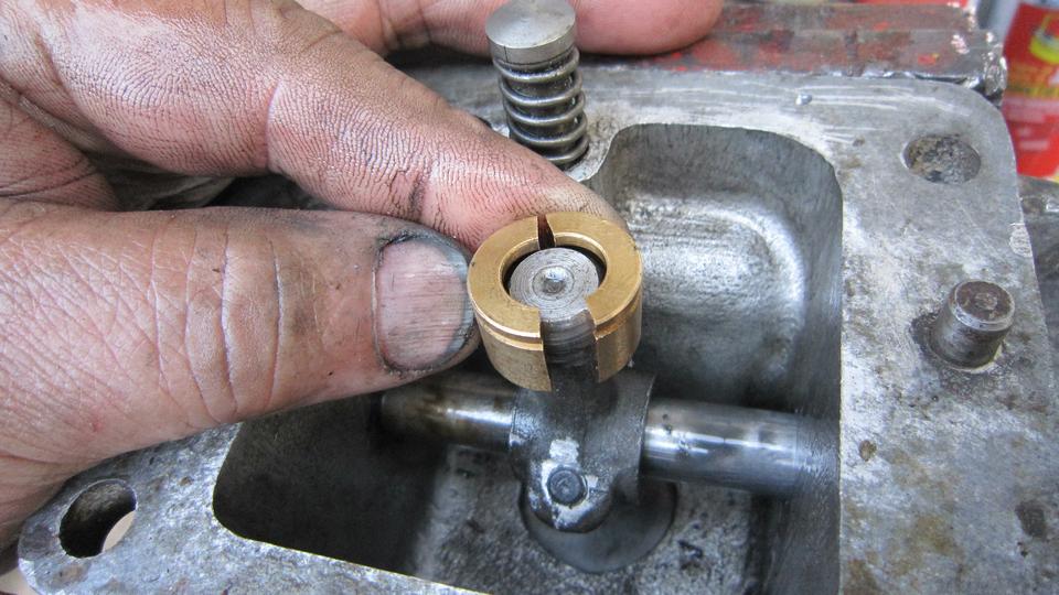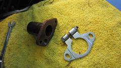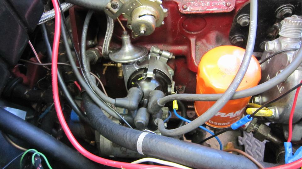Reinstall the gear, "larger offset upward" (key slot below center), with the key slot pointing in direction of #1 spark plug. Reinstall the base and clamp plate and distributor with vacuum unit pointing upward. Still missing the olive and flare nut for pipe to vacuum unit connection, and a P-clip to secure the pipe to rear stud on the head.