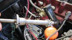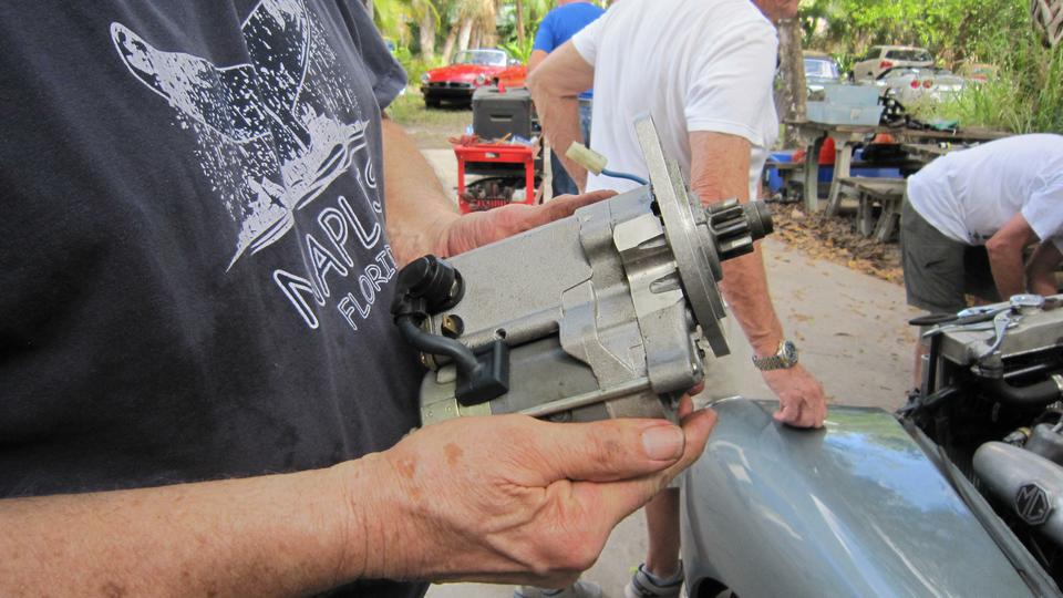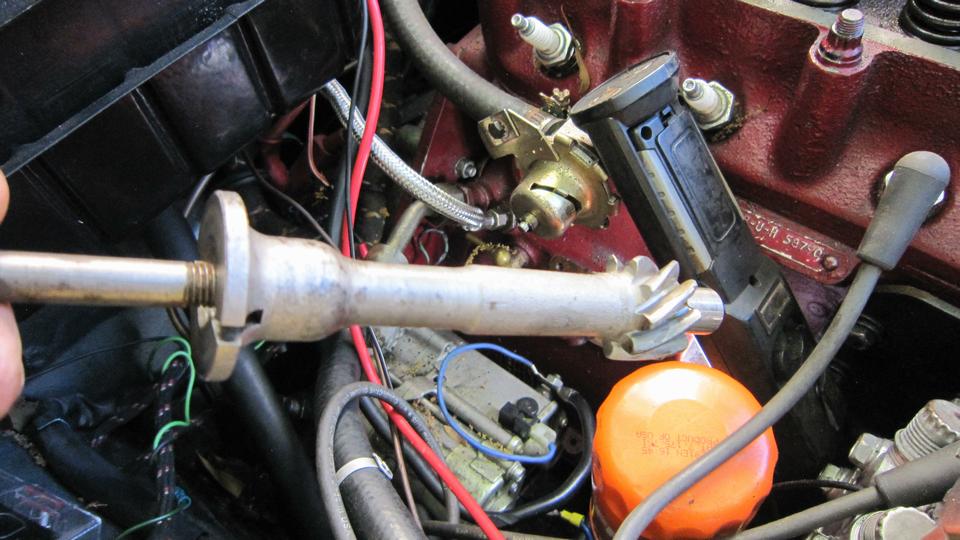 So dig in to re-orient the drive gear, and put it back together. Getting to be old hat by now, but a new tech session for some people. Remove distributor base clamp and the mounting housing, and pull out the drive gear.
