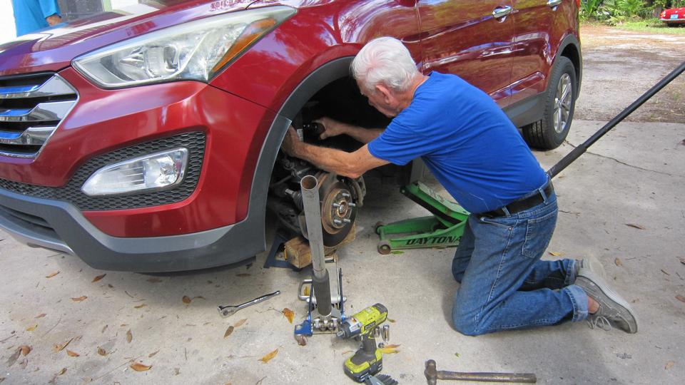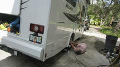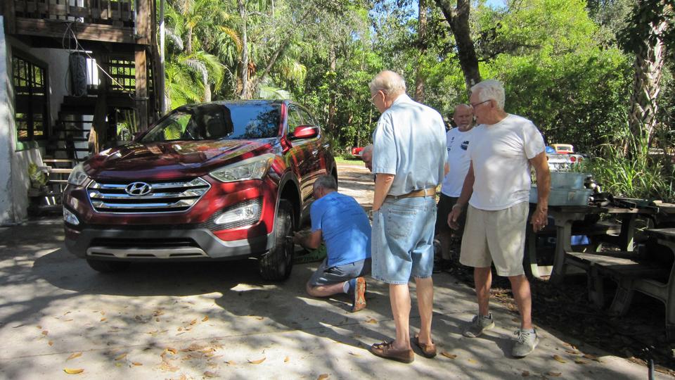 A Honda sport ute came in with some nasty clunks in the left front suspension. I think they were tightening some loose bolts around the McPherson strut, and apparently the noises were banished. Jerry was adjusting tire pressures on the motor home, which can tow a second race trailer (but maybe not for this week end). The caravan was off for Daytona, and everyone else left by mid afternoon.
