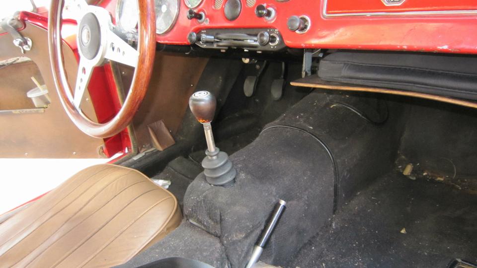 Not long to fix that, putting the intermediate plate on the shifter and pulling the redundant pins out of the gearbox. Just a bit of a fiddle to get the bronze bushing to drop into the mating socket. More fiddle to install eight screws into floating nuts to secure the tunnel cover. Not too long for two guys to tuck the carpet back into place. The newly assembled shifter is crisp shifting with an extra pound of push, but that will loosen up to finger tip shifting with a day or two of use.