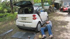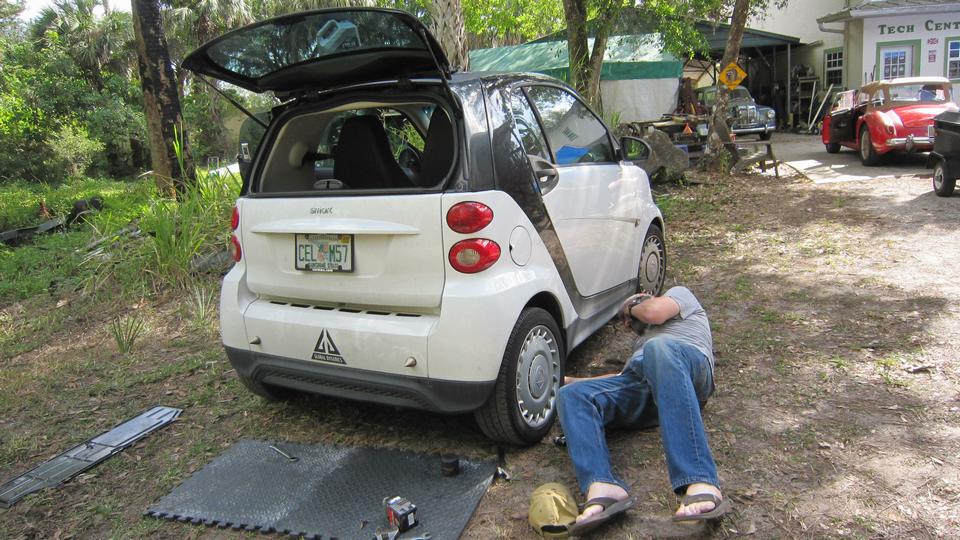 Started as a casual day, just needed to pick up an alternator (between 3-6 pm), and wanting to ship out some shifter housings. Stopped by the shop to pick up the shifter parts. Bumped into a friend working on his Smart car. He was just doing an oil change, but it was a good opportunity to get a peek at the power unit in the tail end below the luggage compartment.
