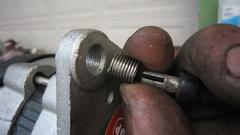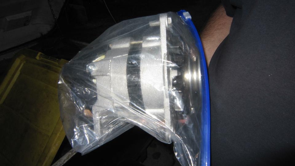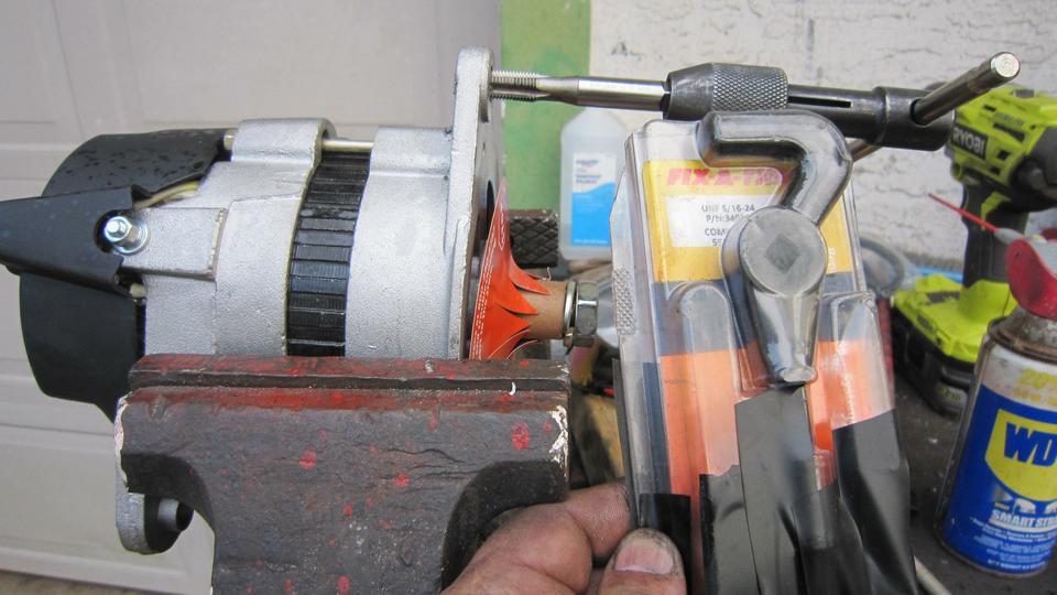 Drill out the hole in the alternator for attachment of the adjuster bracket, and install a 5/16-24-UNF Heli-Coil (tradition to prevent stripping the thread). Install the shaft key, fan, pulley, lock washer and large nut in front. Run it tight with an impact wrench, and mark across the nut for alignment reference. Bag it and toss it into the trailer for spare (and hope it works next time we have to install it).