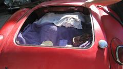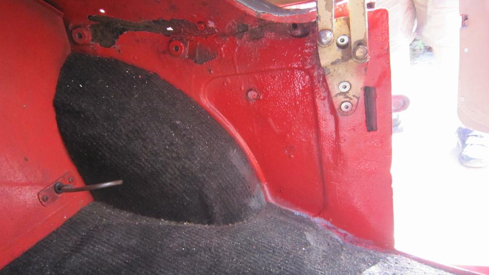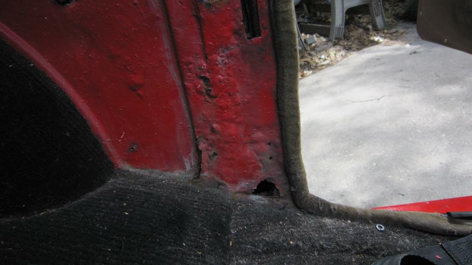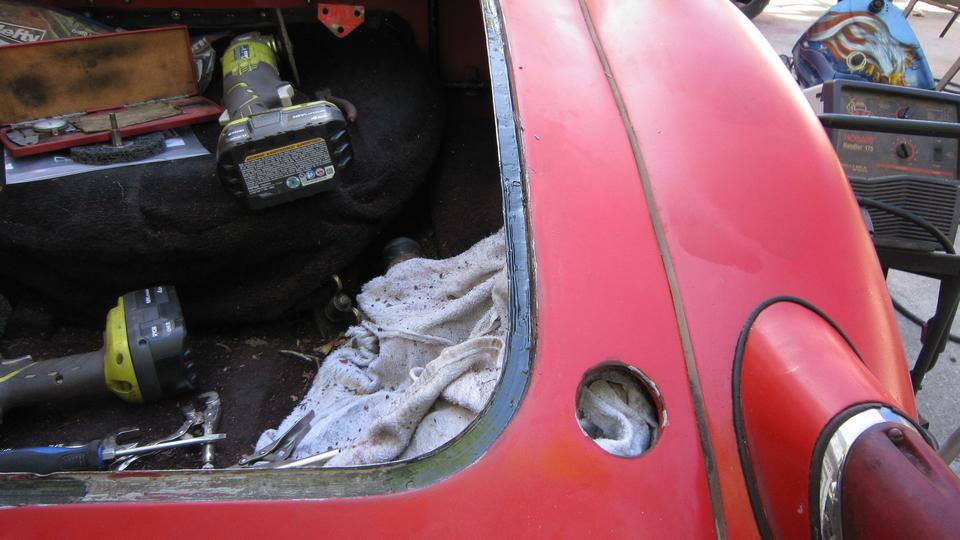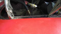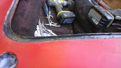 Back to work on the car, this time to attack the rear half in the interest of making the whole car one color again. At minimum, we need to separate the rear wings from the main body to clean and paint in between (not to paint over the piping). Jack it up, and start disassembly from the rear. Remove the rag top frame, rear kick panels, cockpit rear trim rolls (including the side curtain stowage bag). Nine years since the last outer body full repaint, and 15 years since the last body off full inner and outer repaint. So we were expecting to find some other aberrations, and we did. Start with a rust hole hiding behind the rear kick panel down low behind the driver door (where there was a small screw securing the kick panel).