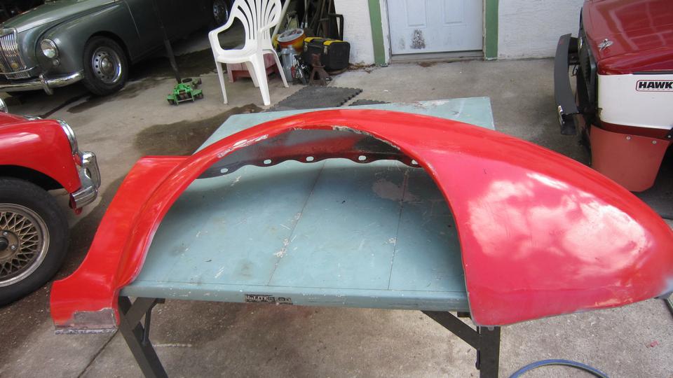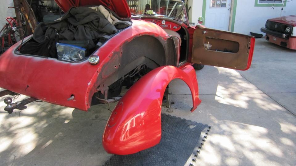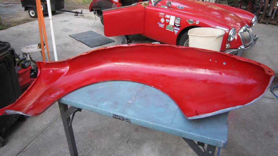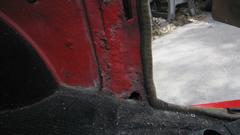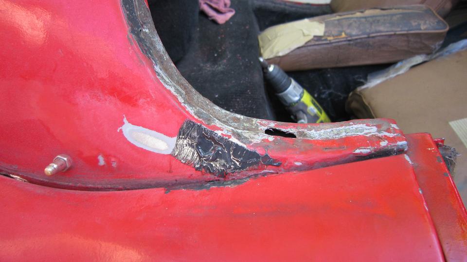 out a couple points of perforation. This is about as bad as it gets when I think I can patch it with JB Weld. Otherwise a proper repair here would require removing (grinding away) one layer of the lap joint to remove rust in between the layers, then welding in replacement metal for the second layer. -- The inside surface sanded for inspection had me thinking back to when I was in a rush and did such a sub-standard panel beating repair. That was a few days before we started this road trip in 2014, when I backed the MGA into my then for sale RX7 and dented the left rear fender on both cars at the same time. We were in process of closing the house just before hitting the road, so these repairs were quite rushed at the time. But it was a solid repaint, no finish failure, just a bit too much filler on the outside. And for now it will stay that way.
