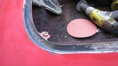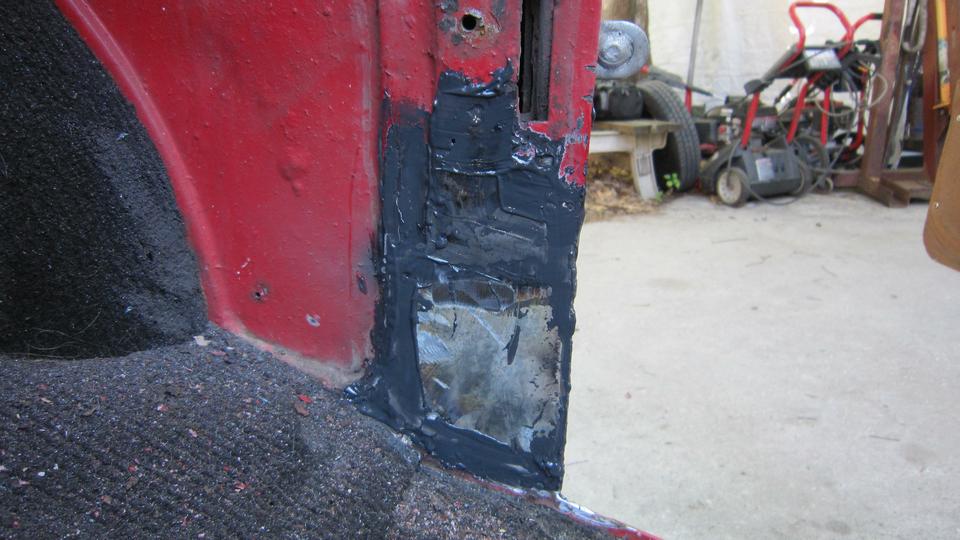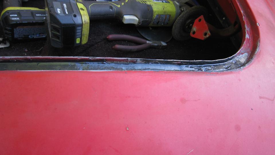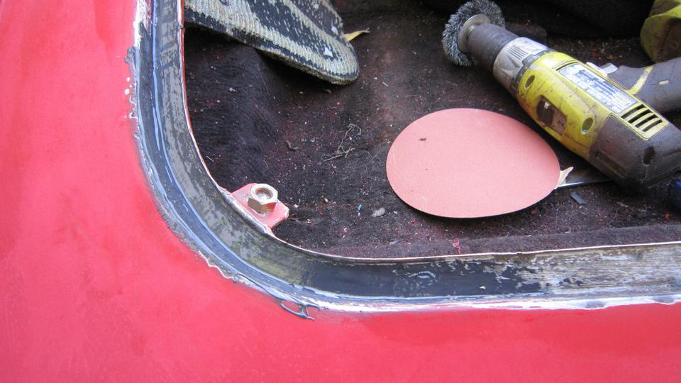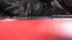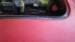 Found a paint blister just above the wing piping aft of the RH door that turned into a finger size hole when ground out to solid metal. We plugged that one with JB Weld, to be ground smooth and painted both sides later. Went after the boot lid gutter with sand paper and a vengeance, and soon had that cleaned up all around. Photo below right is the area of yesterday's rust repair.