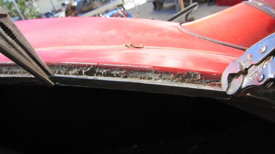 underlying rust. Not bad, except the small round hole where the rasp broke through, but which we will fill with JB Weld. The second picture is front end of the top flange of the right rear wing after grinding. The perforation here was matched with similar perforation on the main body at the mating point. This is a real good time to catch this early rust when it can be sealed with JB Weld before it gets worse and would need metal replacement.