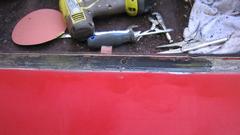 As Elliot was removing rear splash panels and lots of wing bolts, I was removing the rear bumper and power sanding the body tail below the boot lid. This is where a few years ago I was too hurried and applied a second coat of red paint before the first coat was properly cured, resulting in some puckering and wrinkled surface. Now we have the opportunity to fix that problem.