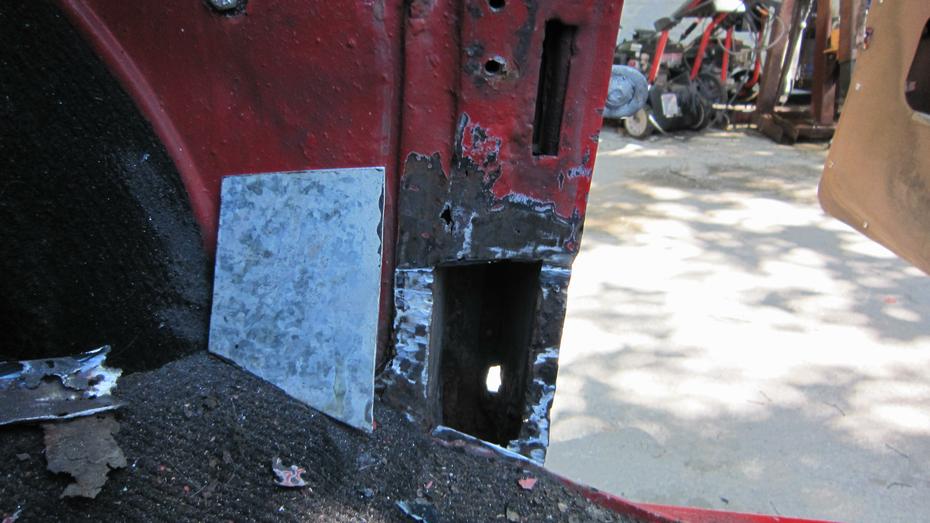 Tech Central this morning found a big rig sitting in our desired work space. So take a little time to kelp unload the Rabbit and stow the trailer in the back lot. Then we jacked the rear end of the MGA up for more convenient access. Remember that little interior rust hole we found yesterday? Time to fix that before it gets any worse. By the time I had picked out all of the loose rust and thin metal around it, this would be easiest to fix by replacing sheet metal all the way across the B-post flanges. The patch piece would be 3-1/2" wide and about 5" tall.