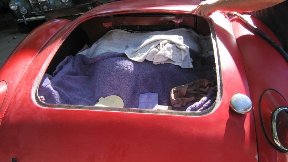 By now you know the routine. Remove rear bumper, tail lights, rear wings and boot lid (maybe 25 minutes). Navigator got to work wet sanding the rear body tonneau from the cockpit to rear valance, while I was power sanding any exposed JB Weld on the outer surfaces. Then I was seriously washing the underside of the rear wings, very filthy, should have done that a long time ago. That exposed a few more paint blisters (rust spots) which we promptly rubbed out with the power rasp and coated with a smear of JB Weld for sealer.