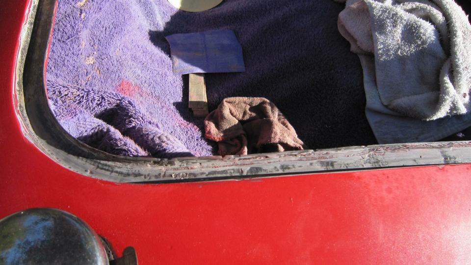 6-pm time to re-install the doors and boot lid (with 6-hour old epoxy urethane red paint), carefully touching only the inside surfaces, Keep repeating, "Do not touch the outer skin". Navigator holding the doors, driver working the shims and screws and alignment pin and power driver. 35-minutes to install two doors (including door-top trim rails and side curtains), and 10-minutes for the boot lid with thumb screws. Not bad, sure to get more pictures by daylight.