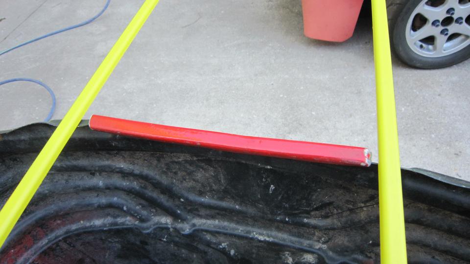 About then our special order primer paint arrived, so we took a few minutes to clean the new lower body trim strips with lacquer thinner, blow dry, and give them a quick coat of Zinc Chromate primer. Bit of a bonus here. While chopping up the old trim strips for trash, we saved one piece that had been repainted recently. That would be on the edge of the trash can rim, the red strip which we will keep for a color sample. Some day we might run across some matching red paint in a spray car (wishful thinking) that we might use for touch-ups.