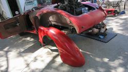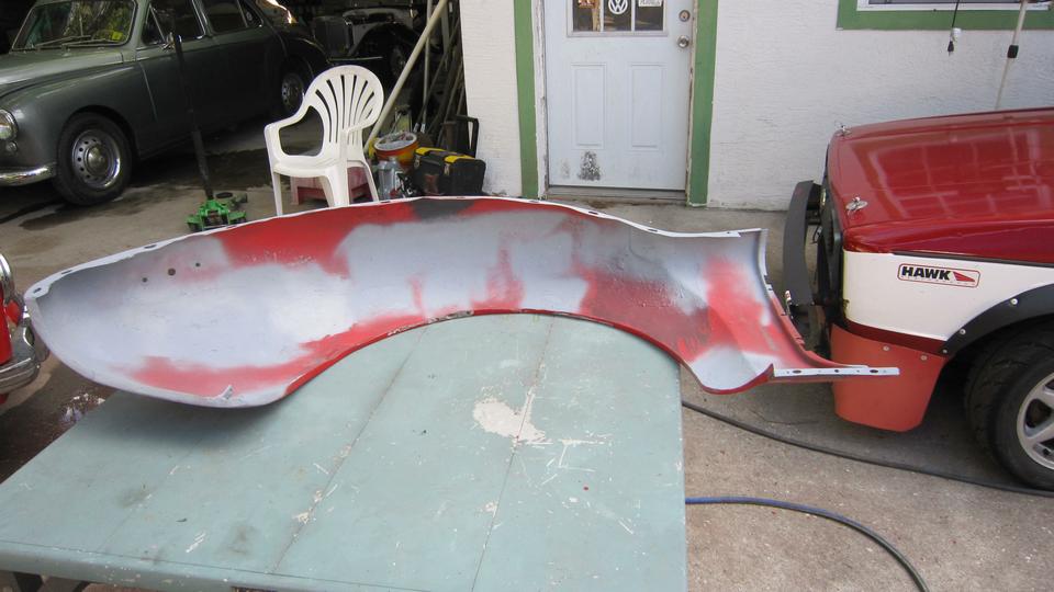 Then navigator nearly fell out of his chair when I sprayed inside of the wings red. He thought we would have to sit there until midnight waiting for paint to dry enough before we could install the wings to drive away for the night. Oh ye of little faith. The objective was to finish paint under the wings so we wouldn't have to remove them from the car again before final painting, save a day off the calendar.
