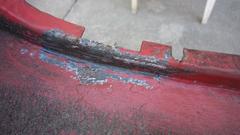 A view of the right rear wing tail end flange after rotary rasp grinding away most of the blistered paint and