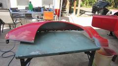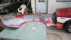 in between. By this time I had a can of primer in hand and was coating any exposed metal or JB Weld, and the mating surfaces for the wing joints. Inside of the wings got power sanded vigorously to remove any loose paint, paint cracks and chips (lots of road rock chips), and primer on any exposed metal. Outside of the wings got wet sanded to scuff the entire surface to accept new paint. By late afternoon we were getting very close to our objective for the day, to be ready to spray the finish coat tomorrow morning. Pics below show fruits of the day's labor.