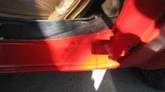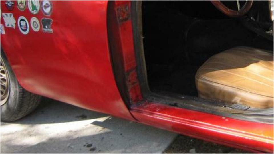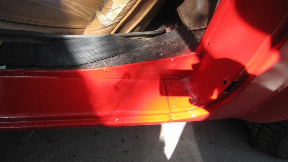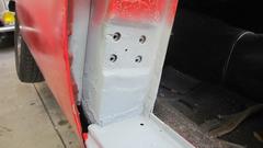 doors, after the front end repaint, when we noticed some heavy paint blistering (rust spot) at bottom of the driver side B-post, below the lower hinge, just above the body sill. This was our day to fix it. By the time we finished cutting out thin rotted metal back to metal thick enough to weld, there was a remaining hole nearly 1-1/2 inches high most of the way across the rear face of the post, and 1-1/4 inches forward on side of the post. Then pull out and vacuum out a fist full of rust flakes and dust, pretty shocking stuff inside.