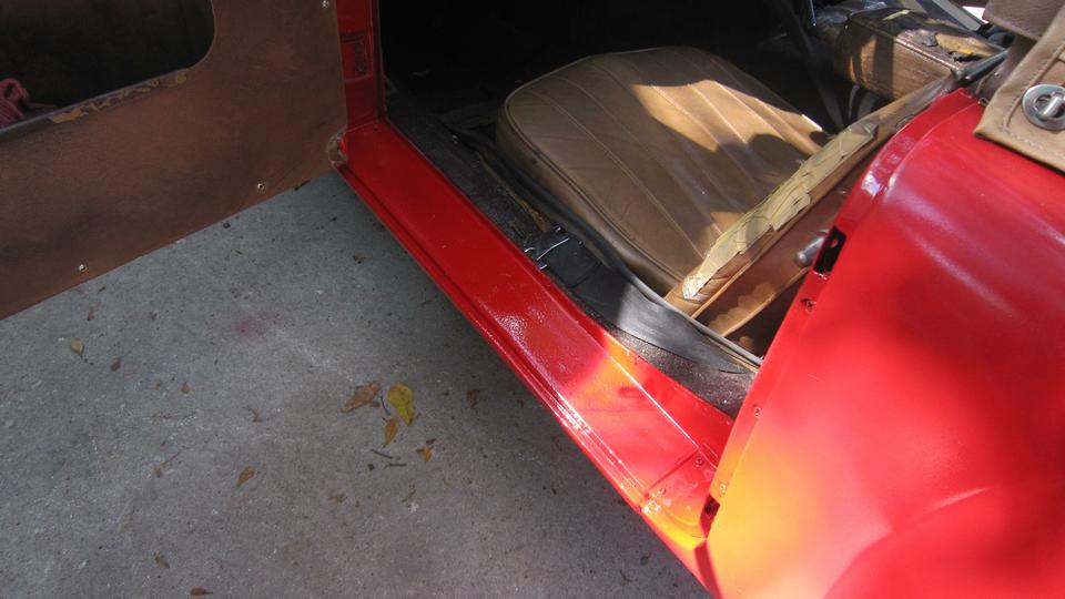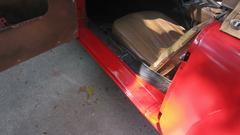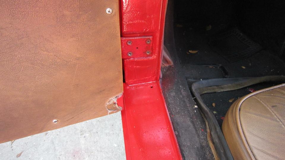 First things first, priorities, needing time for pain to dry. Here's what the driver side body sill and A-post look like after yesterday's welding repair and primer paint. Grab the power screw driver and remove 8 screws to remove the door. Smash a couple sheets of cardboard into place to serve as masking. Spray the sill and pillars with Sunrise Red from the aerosol can, and screw the hinges back together to reinstall the door. Quick pictures, then close the door before 20-MPH wind gusts blow tree chaff into the new paint. Then just get away from it for a few hours.