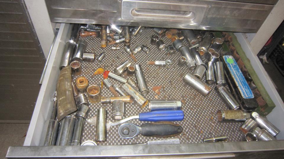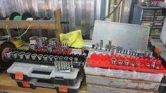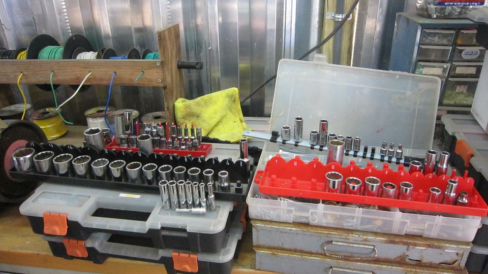I had some time to lend a hand with a special project. Someone downsizing their home workshop space had donated a large bucket of tools, mostly old socket wrench parts. So we were spending a hour or so sorting sockets to assemble several complete socket sets, 1/4", 3/8" and 1/2" drive, inch size and metric, standard and deep well sockets. All of these were ultimately going onto socket storage sticks to make it easy (hopefully mandatory) to put tools back in the proper place after use. Someone hollered "Lunch", so we all had a short break.