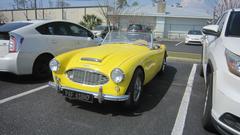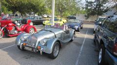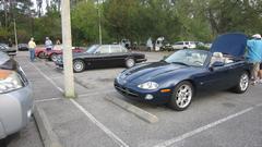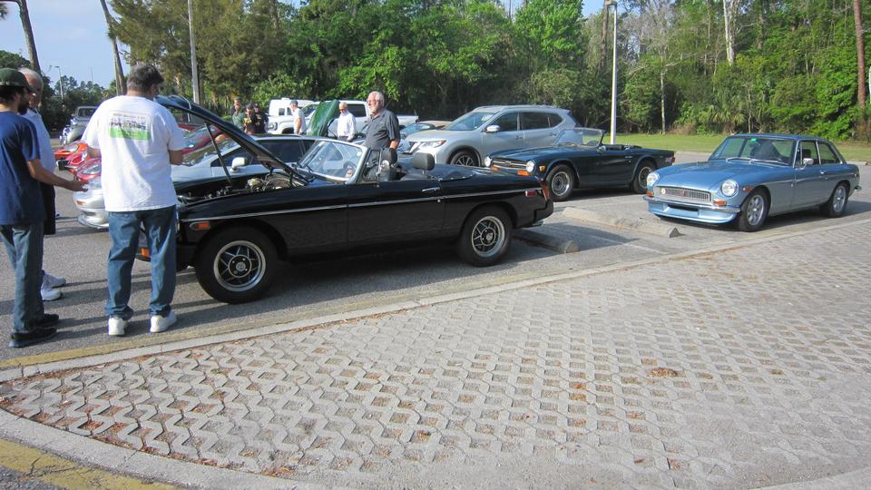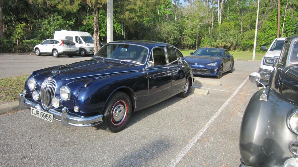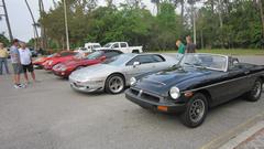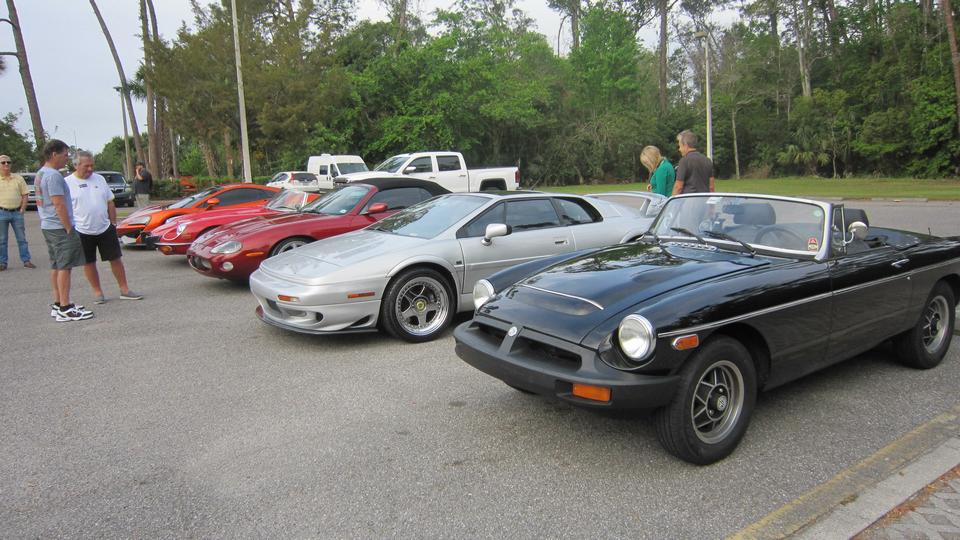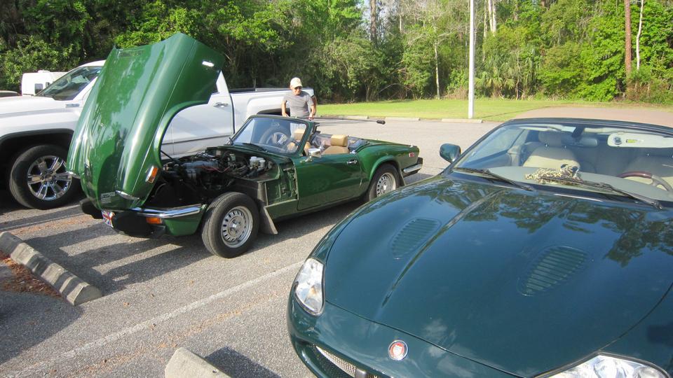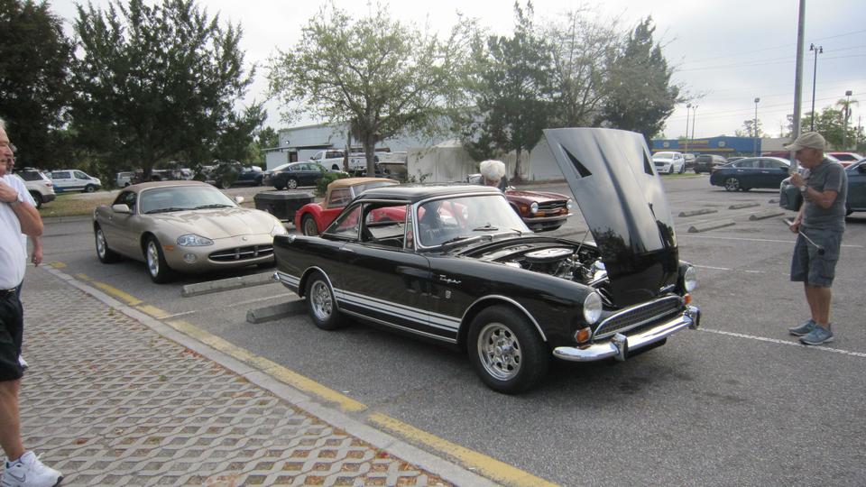 Good morning meeting with British Car Club of Central Florida at Patio Grill Restaurant & Lounge in Sanford, FL. Several cars there before us, so start taking pictures as more were rolling in. First curiosity was what appeared to be a rubber bumper MGC, which of course never existed. Turned out to be a late model MGB LE with an MGC bonnet. Next in line was a Lotus Esprit (a.k.a. James Bond car), a modern Jaguar drop head coupe (XK8 I think), a 1974 Jaguar E-type (with the Sabrina overriders), and a modern McClaren. Turn around to see an Alpine Tiger, restored to be mostly original, with a pair of added exhaust vents in the bonnet.