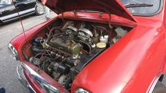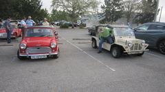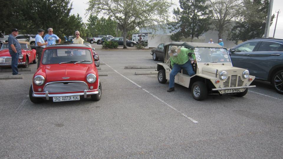 Next arrivals were a pair of Austin, Minis. The red one with added trim to make it look like a Mini Cooper, including dual carburetors. The grey one being an Austin Mini Moke, also converted to dual carburetors. These things might go 80-MPH on their 10-inch wheels, but don't know for how long. My primary interest here was that from 1969 to 1973 I drove an Austin America, successor to the MG 1100 sport sedan, like a slightly bigger version of the Mini with 1275-cc engine and running on 12-inch wheels, easy to do 85, but not much more.