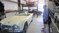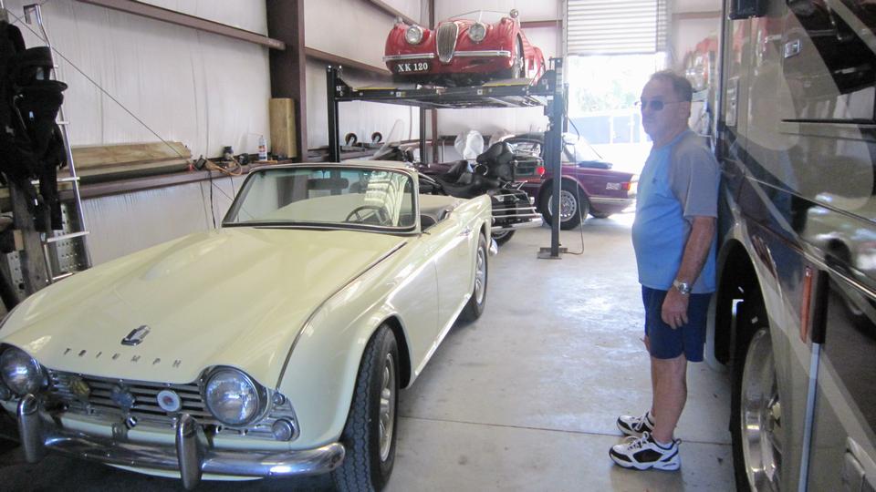 Then we were off to visit Rich Roesch at his warehouse workshop in Panama City Beach, FL. He has been patiently waiting for our arrival for a couple months. He has an interesting assortment of toys including a large motor home. He had recently divested himself (at least at this location) of an assortment of vintage motorcycles, leaving more space for vintage British cars. Now he has a nice Triumph TR4, a TR6, a Jaguar XK120, and I think a Harley Davidson motorcycle tucked in there somewhere.