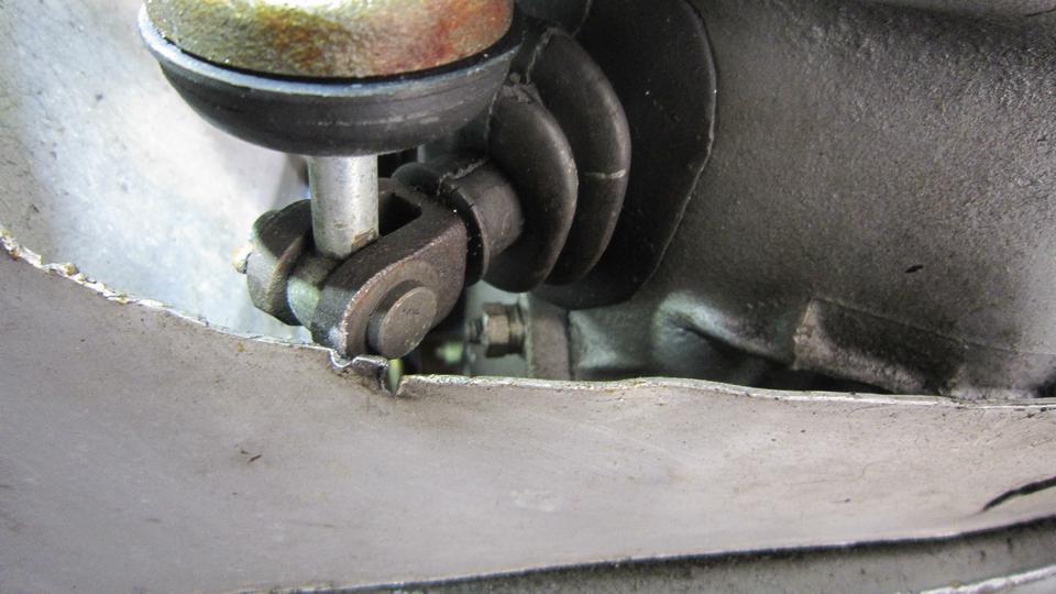 The clutch slave cylinder works okay, just a bit of interference with the belly pan (easily fixed). We removed the tunnel top cover and the remote shift extension assembly, nothing wrong there. The next selector rod input lever was properly in place, so the mechanical problems here would be entirely inside of the gearbox housing. The engine and gearbox would have to come out for access even just to remove the gearbox side cover. Bummer, big job beyond my time limit.