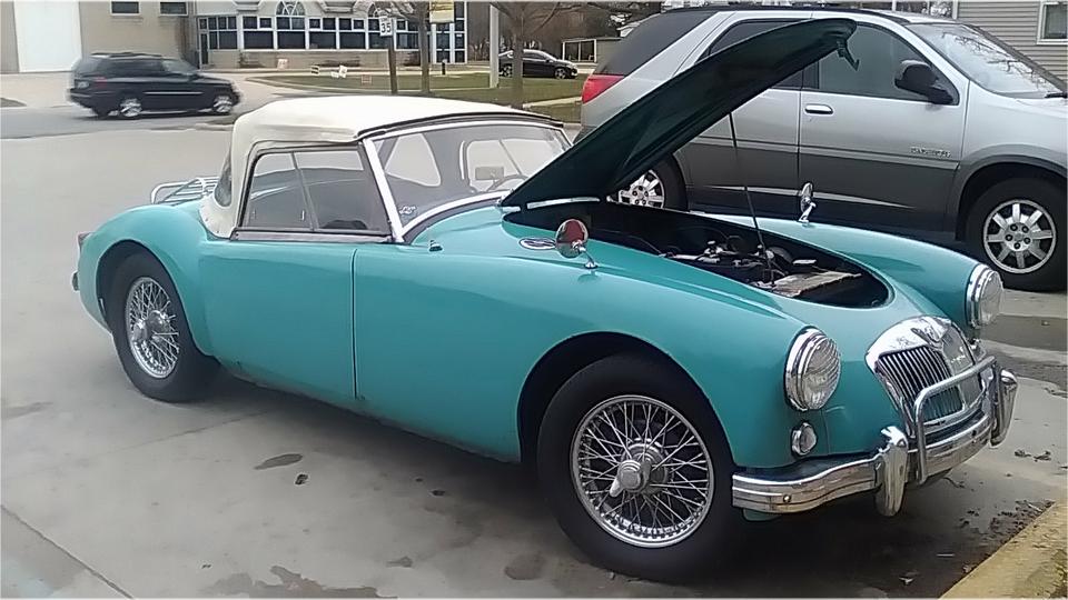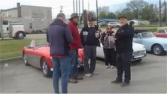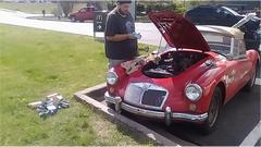 Visiting with Shane Rudd in Rochester, Indiana. He wanted to give me a ride in his MGA for my appraisal. Not such a good result, a few blocks later it was overheating. Bit of a suprise, since he had driven it hundreds of miles just a few days earlier without incident. Quick stop at the O'Reilly store. While refilling coolant I noticed the cooling fan was on backward (actually I think I noticed that last Sunday). After cool down and refill and restart there was a rattling noise up front. That turned out to be a loose crankshaft pulley. Shane had previously replaced the crank nut due to stripped male thread on the nut. He thought the new nut was tight. Maybe so, maybe no, but will need to remove it to check again (while the radiator is out to flip the fan blade over). Hope the female thred in the crankshaft is not damaged, as that could be a difficult (and expensive) repair.