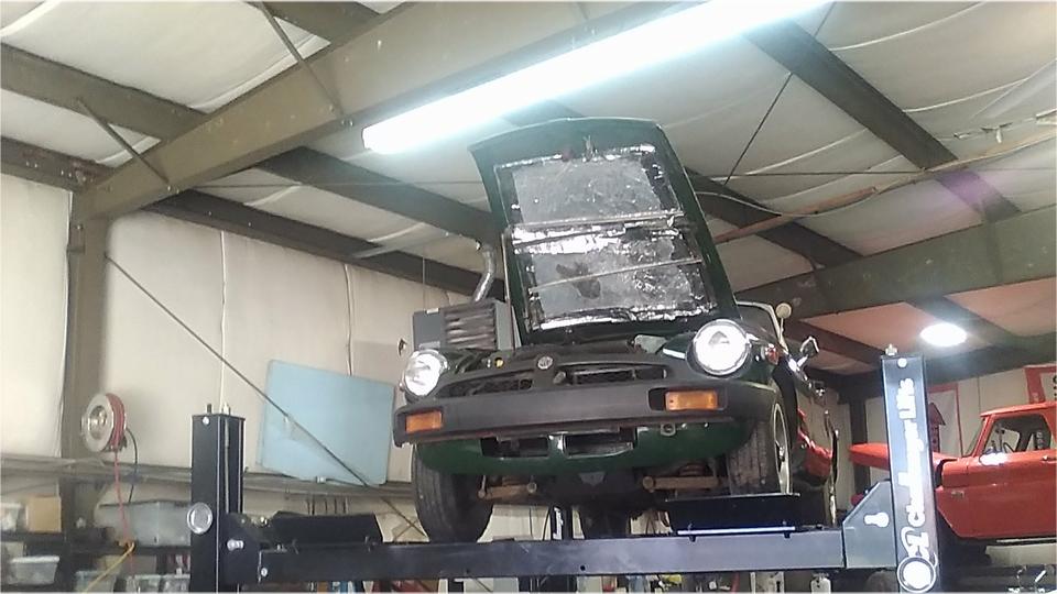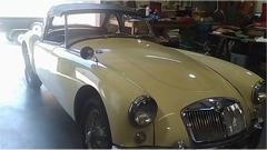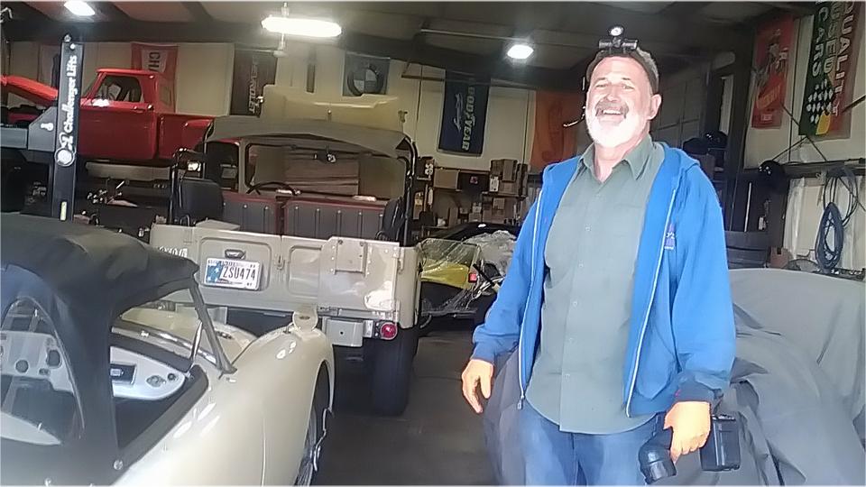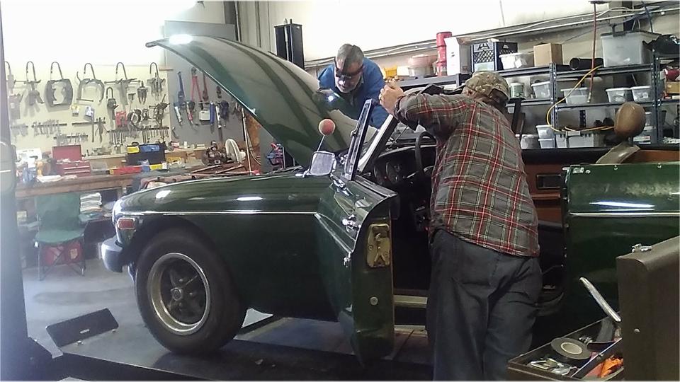 The last time we were here (April 2016) the guys were sanding on an MGB club project car. Today's come-on call mentioned his MGA 1500 with 1622 engine with "15" head. Odd combinaton, also has "1600" badges on the cowl (retro fit). The issue is a loud knock on start up that soon goes away, but comes back once the engine is warmed up, even though it has good oil pressure.