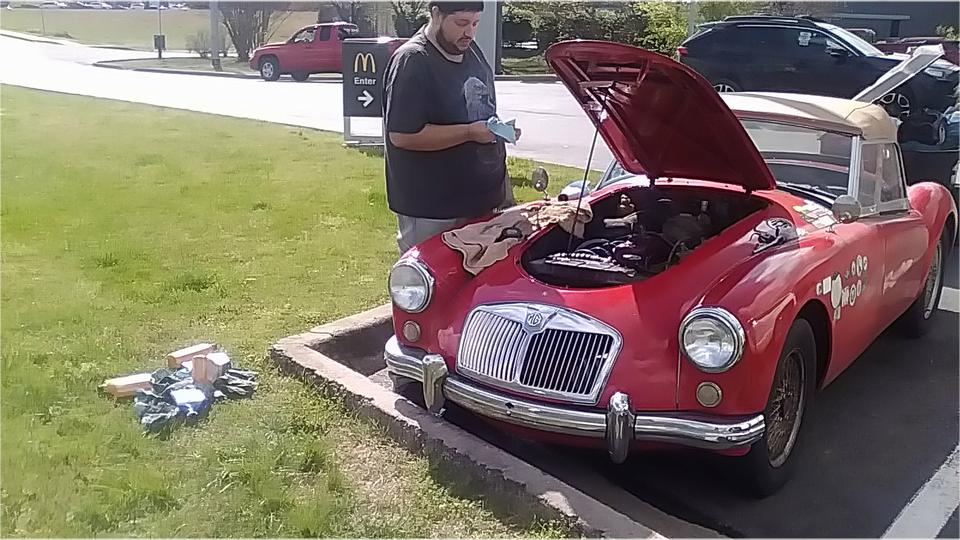 Heading south into Tennessee looking for a good breakfast spot. We knew the first exit had no wall outlet, so skip that one. Second exit, also no outlet (maybe under same management), so move on. Third exit, navigator got out to to check first, and "Oh crap" even before he stepped away from the car. Oil from under the bonnet all over the right front wing. Another blown oil cooler hose, this time from rubbing on the ignition coil bracket mounting bolt on the inner wing. The sump was empty, but fortunately we hadn't driven far this time.