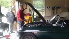 Dropped in to visit David and Johanne Davidson in Huntsville, Alabama. Having taken us a while to get here, last year (2022) Dave sold the MGA 1600-MK-II he used to have and bought an MG TD (under the cover) as well as an MGC. The MGC had been running a bit rough, so open the bonnet and fire it up, and get it up to normal running temperature. After a bit of poking around, the carburetors were out of adjustment, the front one running way too lean, and the rear one running a little rich. Not too long to make a few adjustments, and the engine was running much smoother.