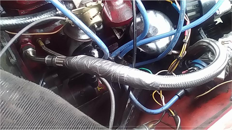 This it not great wrapping tape over oily stainless steel braid, but I gave it my best shot. No-go on the first try, still gushing oil at one end of the tape wrap. "If you haven't fixed it yet, you haven't used enough Duck Tape". So wrap it with more layers of tape at the offending location, and check again. That seemed to work, so top up the oil and head for the next exit, keeping one eye on oil pressure.