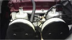 It idles a little rough with carburetors mostly in order, and runs on after ignition switch off. Compression test shows 195-psi when cranking, so I say wow, until he mentioned crowned pistons. Then smile and tell him to use the best premium grade pump fuel he can find, preferably with no alcohol, if he wants to avoid expensive racing fuel for street use. And yes,it does go like scat when you punch the loud pedal with 1500 pounds, high compression, and neither of us know what kind of cam it has (definitely not stock)