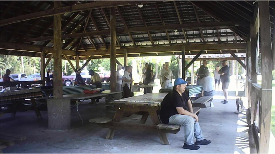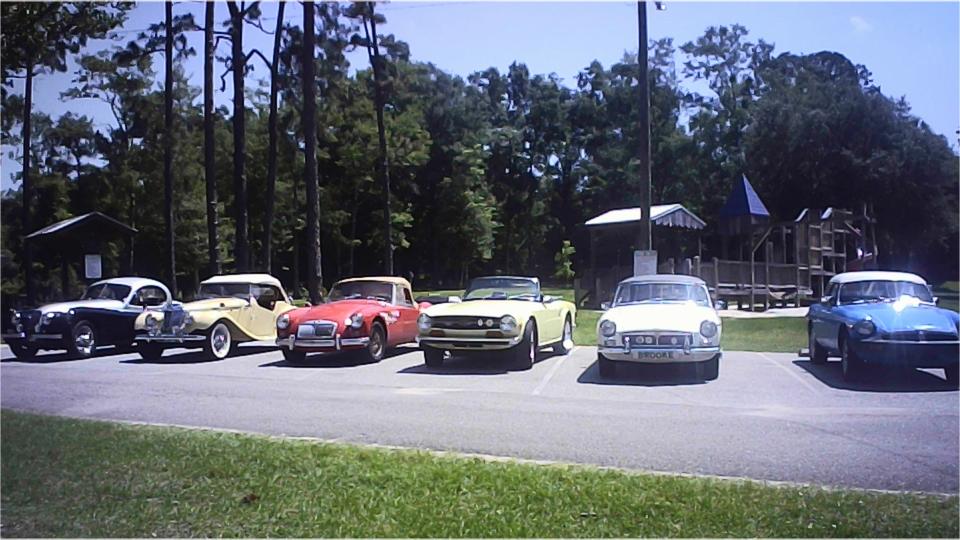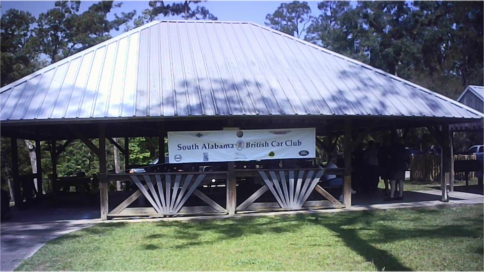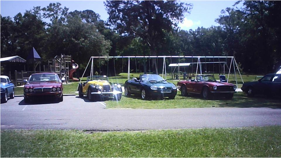 Had a 11-am picnic appointment today with South Alabama British Car Club at Oscar Johnson Memorial Park in Silverhill, Alabama. We were a bit early, but there were a few cars there already, doing set-up work I suppose. Then they were rolling in faster than I could take pictures. Good to have a shade covered pavilion and a big fan, as it was pretty hot in the sun.