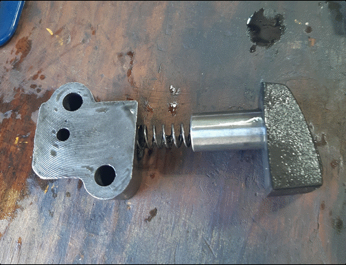 Couple phone calls and pictures from Vincent Anderson and Ray Graham in in Boonville, Indiana, still trying to track down a rather loud knock at front end of his MGA 1622 engine when the engine is idling (but no knock at higher speed). We were looking at this a month ago on April 3rd. A stethoscope says the noise is loudest at the timing cover. The chain tensioner found inside was an odd style with no anti-return latch, only a spring inside, and also no pilot spigot where the tensioner should engage the engine front plate. A new timing chain and tensioner were installed and the knock is still there. Drive you nuts kind of problem.