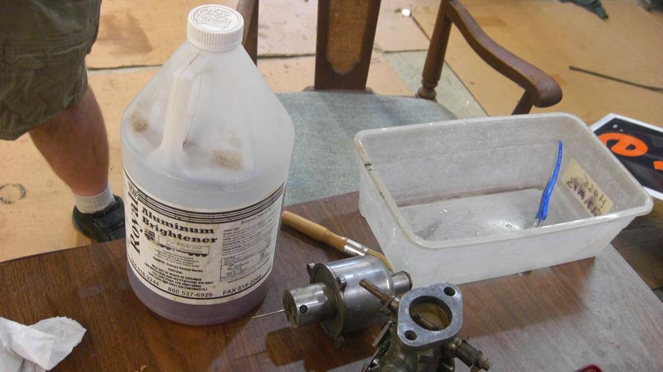 Cliff came up with a jug of something called "Aluminum Brightener", so we might give that a try. The results were not so good when the first pot metal parts turned black (or very dark grey). When all else fails, read the instructions. So you're not supposed to dip and soak the parts, just a light mist spray, and rinse it off after a minute or so. With a longer soak, it looks like this stuff does not like the zinc in the pot metal. So we rinsed it down with lacquer thinner, and just washed the rest of the parts in lacquer thinner, and then it was time for assembly.