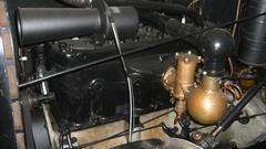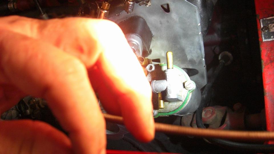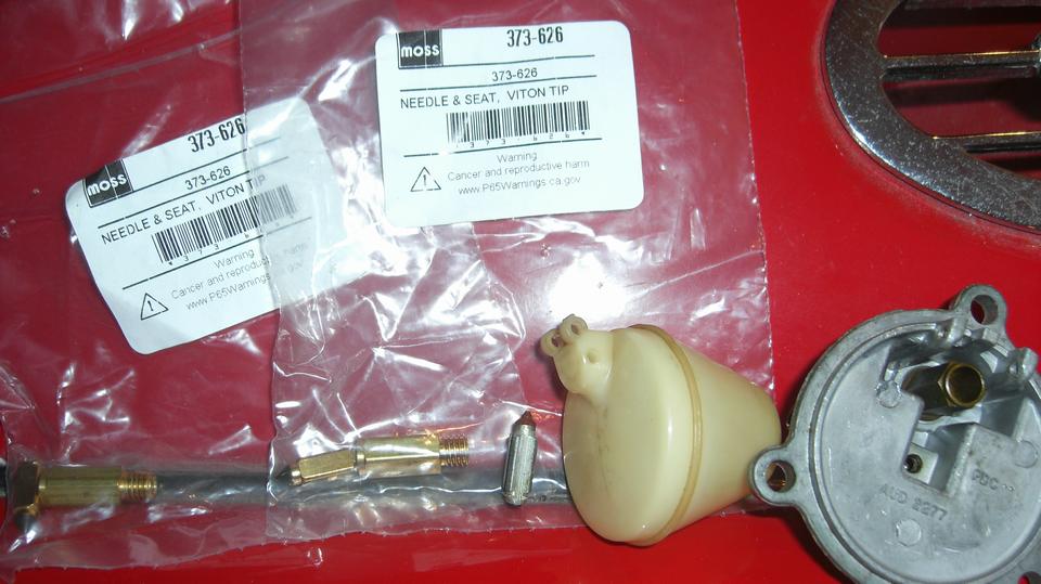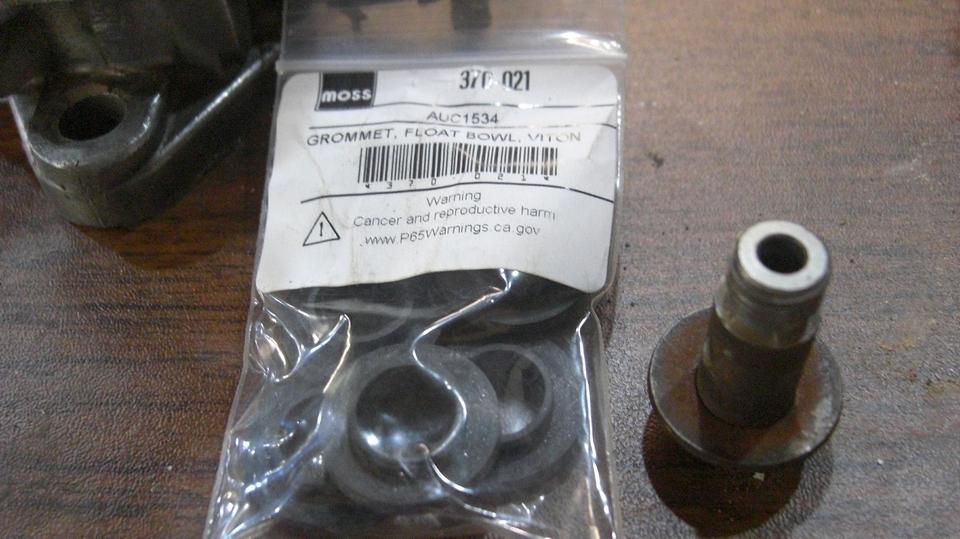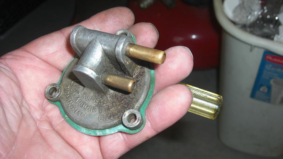 for a few miles to get back to Cliff's garage. There it took only a minute to determine that it was spewing fuel out of the rear carburetor float cover as fast as the fuel pump could pump it. Not long to R&R the float cover to replace the soggy sunken brass float (so much for good used parts). Navigator make the executive decision this time to install two new floats, and I would agree with him here. A bit later we would re-fill the fuel tank, and knowing what gas mileage it normally had, I calculated that it had dumped 2-1/2 gallons of fuel on the ground in just a few miles.