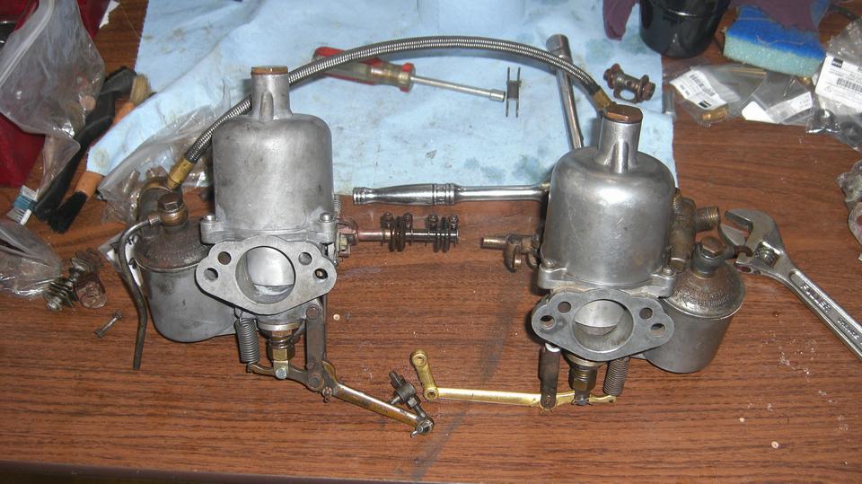Get the old carbs off the car, and swap over the float covers with new gaskets. Install a new throttle arm to replace the old one with an egged out hole. Nice to have spare parts in the Magic Trailer.