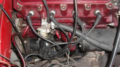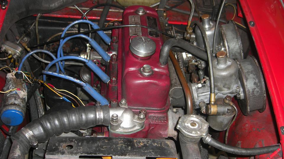 Dang. Woke up with the queasy stomach, so this was going to be a slightly uncomfortable day (to put it mildly). But we were determined to check out the MGA Coupe to find out why it was ill (sympathetic harmony?). This is an MGB 1800 engine with SU HS4 carburetors. I don't suppose it mattered that they were two different model numbers, one with a fixed needle and one with a floating biased needle (just the way it came with the car). There was fuel feed to the carbs, and the spark wires were in correct sequence (even though the distributor was disoriented), so let's see if it will fire up.