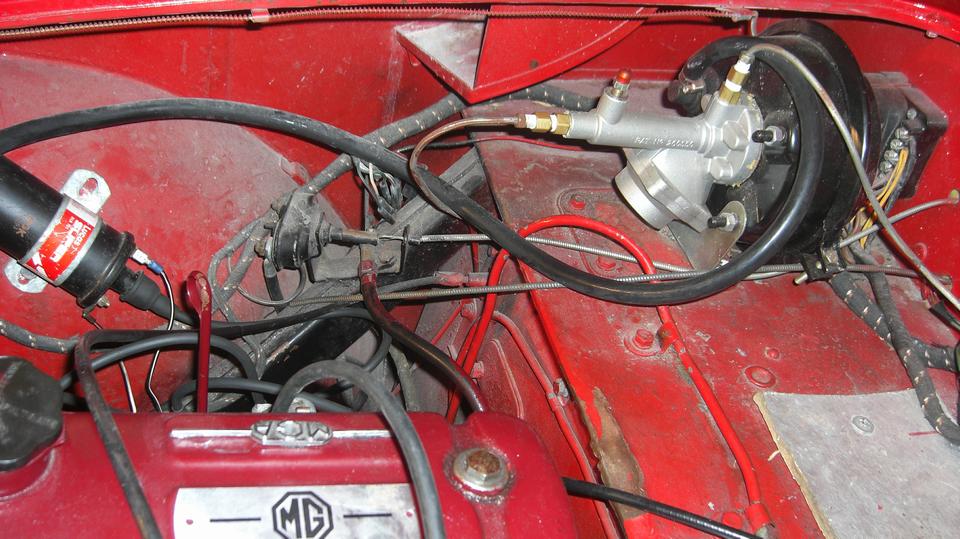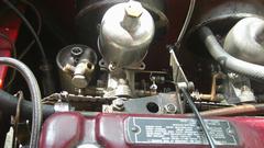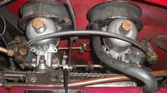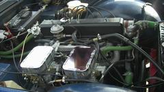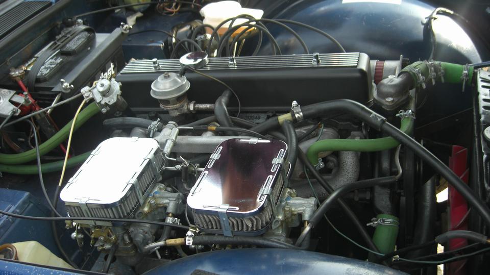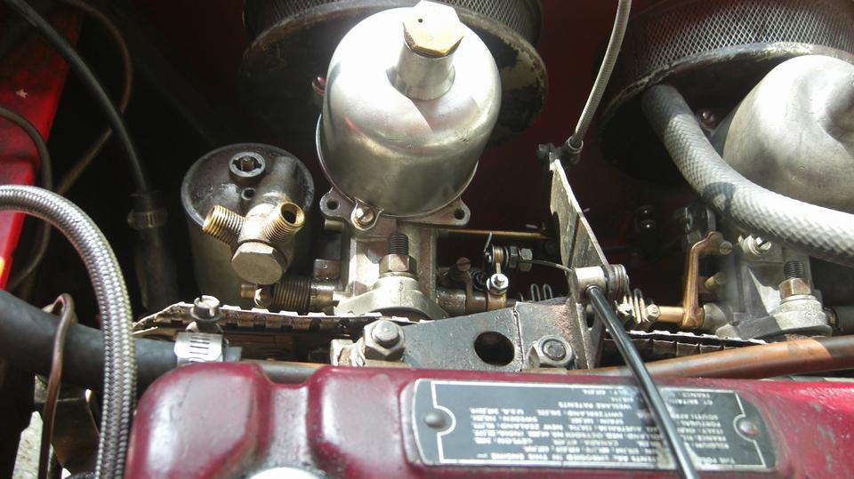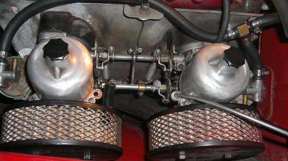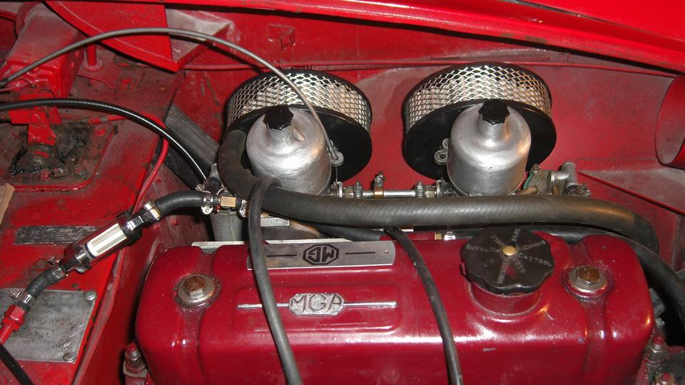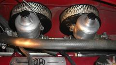 Take another break, grab new gaskets and reinstall the air cleaners. Discover the hard way why MGA air cleaners do not like to install on MGB carburetors. The MGB choke rocker shaft and cable and arm are in the way of getting fingers and a wrench in there to install the inboard bolts for the air cleaners. Be persistent, loosen the cable arm to rotate it out of the way. drop the bolts six times each, use two fingers like tweezers, drop the wrench several times, skin some knuckles and bleed on it a little. Eventually succeed, reorient the cable arm, and recall why the factory changed to brackets with captive nuts and long through bolts for the later MGB air cleaners.