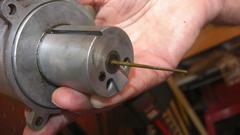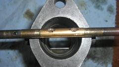 throttle bodies and shafts would definitely go to the dump, but first I had to get the picture of the badly worn throttle shaft(s). This was very interesting, because I had only recently learned that SU HS4 carburetors had bushings cast into the pot metal throttle bodies. The bushings are located flush at the outboard ends of the bearing journals, but do not quite reach to the throttle bore (by about 1/8-inch). Here you can see a groove worn in the shaft each side of the throat where the pot metal was abrading the shaft. This because as the journal bore wears a little, the pot metal material is more abrasive than the bushings. Cute, huh?