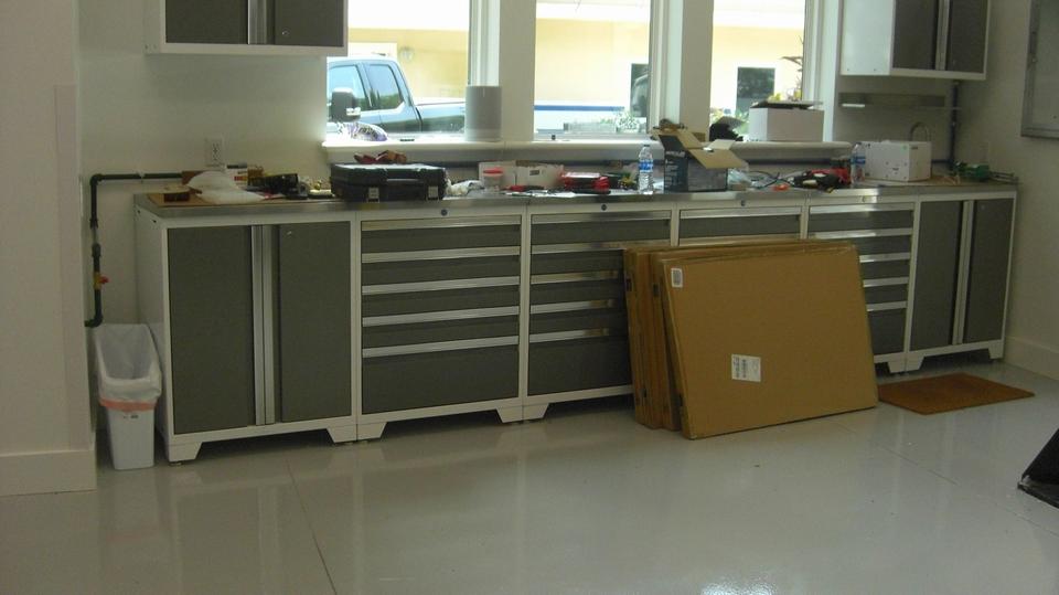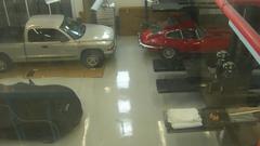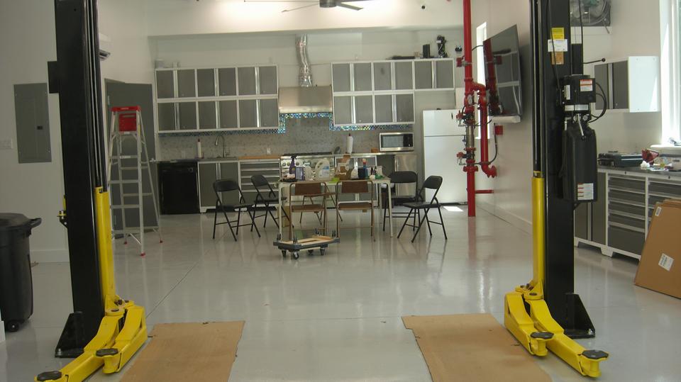 Inside with my back to the large garage door (right side of the building) there is a heavy duty frame lift hoist under the high ceiling, and lots of tool cabinets to the right. In the back what might pass as a kitchen, except all of those cabinets are actually shop grade tool cabinets. On the wall to right of the table and chairs is a large flat screen TV.