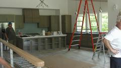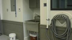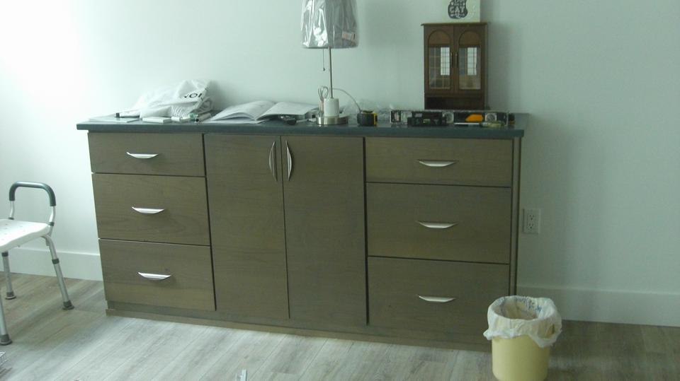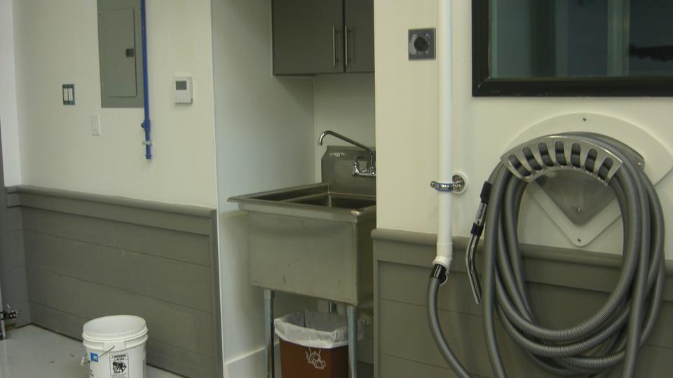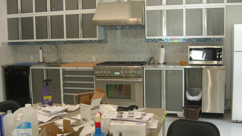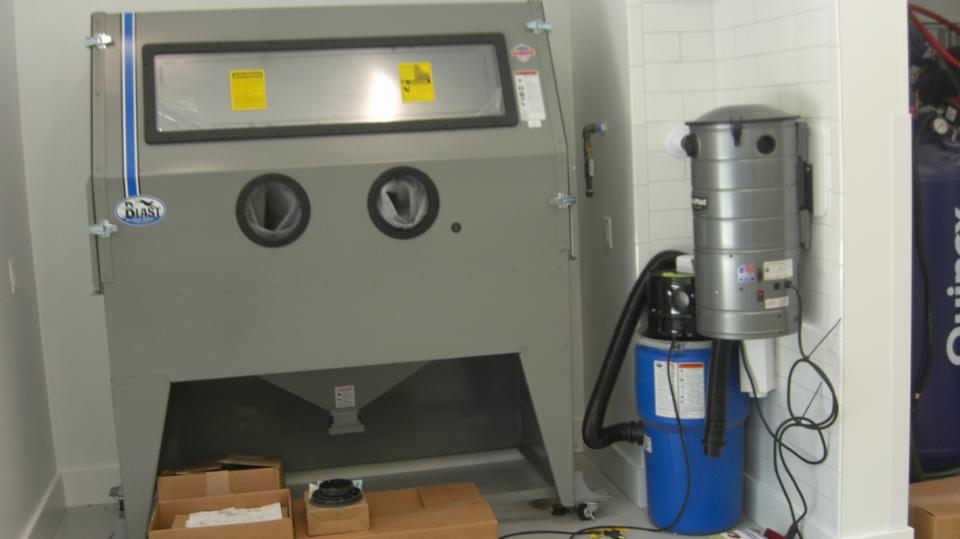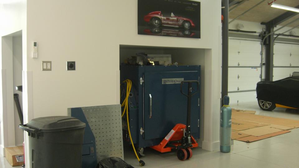 Look to the left side of the table and chairs to find his and hers rest rooms (including a shower). A peek down a short hall to the left reveals a sand blasting cabinet, a vacuum system to keep the place clean (air compressor is located and insulated behind the wall in the larger shop space). A step farther on has a Dillon Queen oven for baking powder coat paint parts.