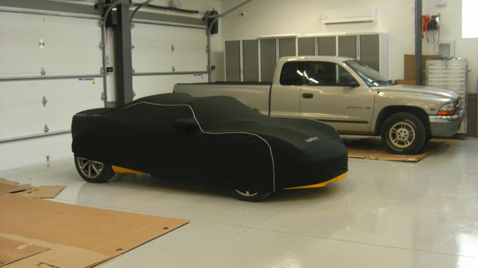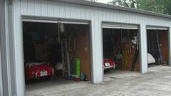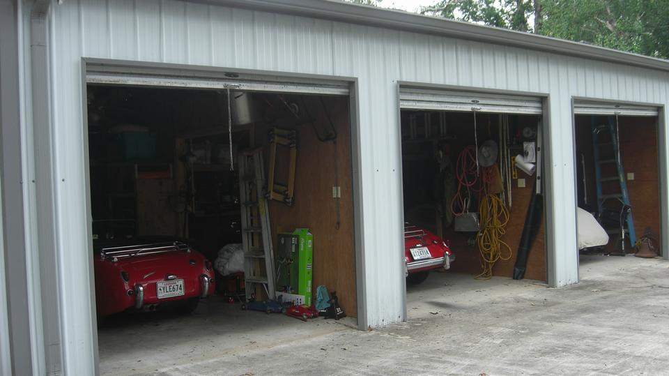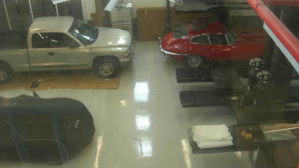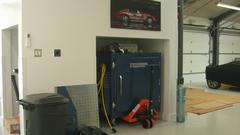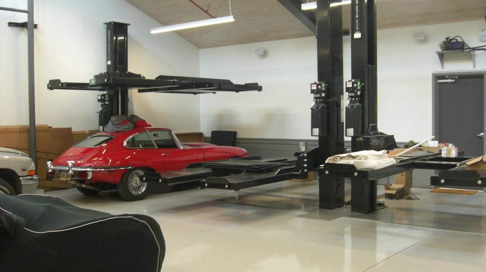 Through the hall to the garage space find three double deep bays with lifts in the back that can serve as service lifts or double stackers for more storage space. Lots of storage cabinets, and I suppose they may roll in some more tool cabinets. Power outlets and air piping all around, the wash basin. I think the large coiled hose is connected to an exhaust scavenging system so they can run the cars inside without opening the doors.