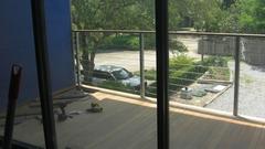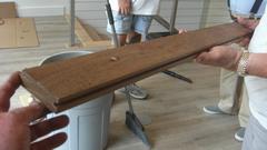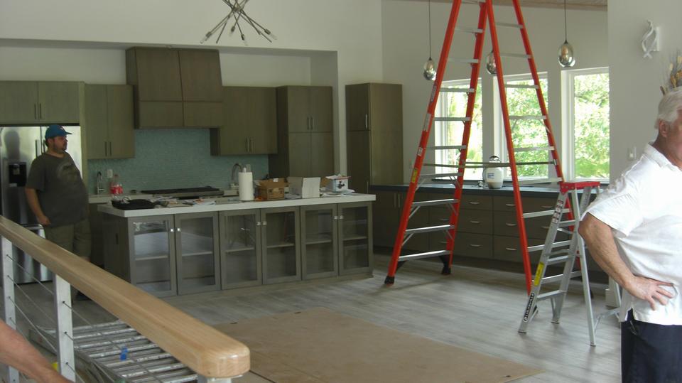 Back up front there is a nice open air deck, in process, nearly finished laying down teak hardwood deck with wood pegs and stainless steel screws. Look to the side again, and there is a big window looking down on all the nice cars expected to be housed in the garage.