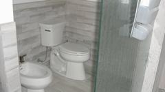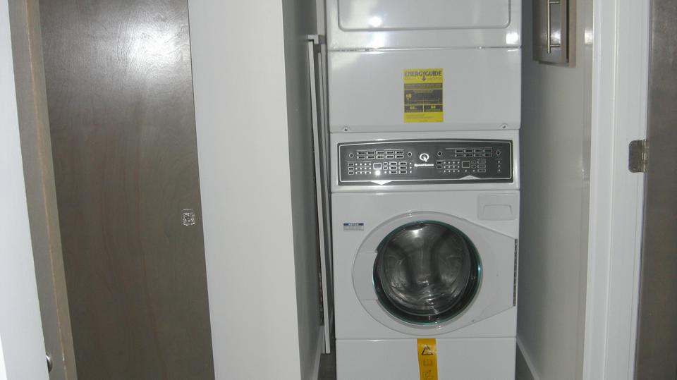 It has a nice bathroom with full facilities, including a bidet. A step back into the hall, turn left, there is a washer/dryer stack for laundry room.